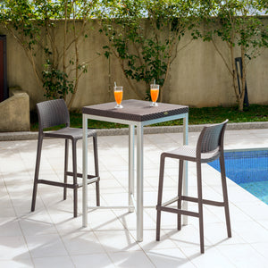 Materials & Features • Polypropylene tabletop and seat with sturdy aluminum tube legs • Stackable bar stools for easy and space-saving storage • Wicker-look texture without the worry of fraying or unraveling • Water and UV resistant — built to withstand outdoor environments • Easy to clean — just wipe with water and a cloth, no chemical cleaners required